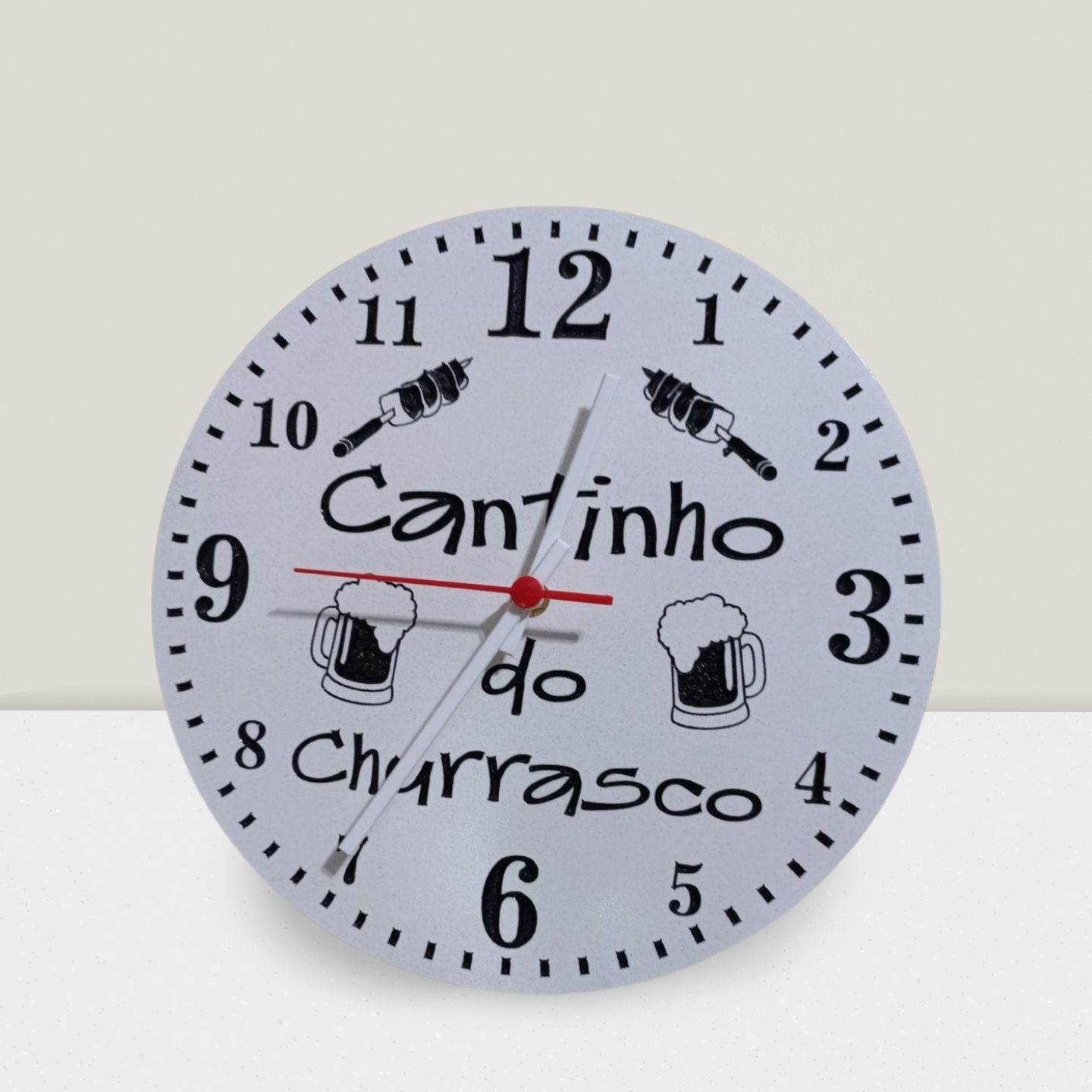 Relógio de parede cantinho do churrasco, feito em mdf medindo 28cm de diâmetro, envernizado.